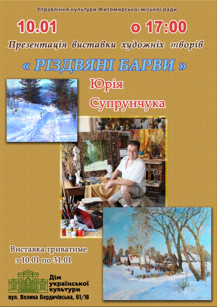 10 січня о 17:00 год. в Домі української культури відкривається виставка Юрія Супрунчука "Різдвяні барви". Унікальність колекції полягає в тому, що художник представить невідомі свої роботи широкому загалу. Житомиряни та гості міста можуть побачити поєднання зимового холодного пейзажу з теплом і затишком домашньої оселі.